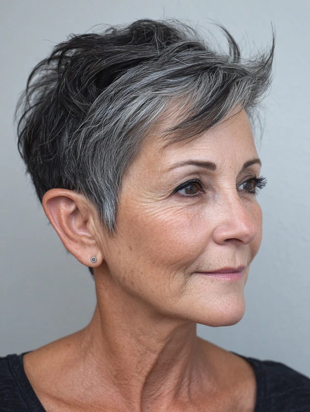 A layered pixie with height focuses on volume at the crown, drawing attention upward. The shorter sides prevent bulk near the chin.