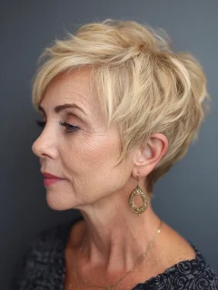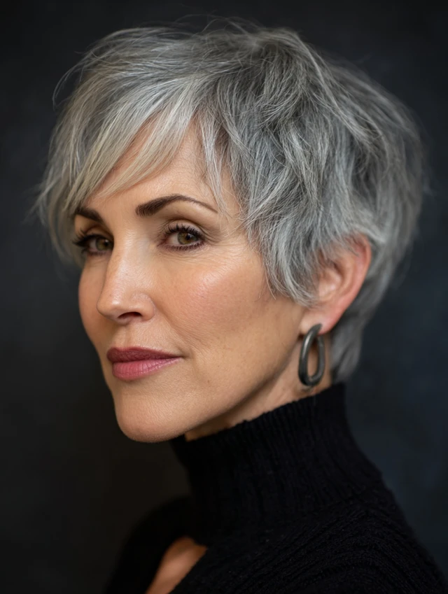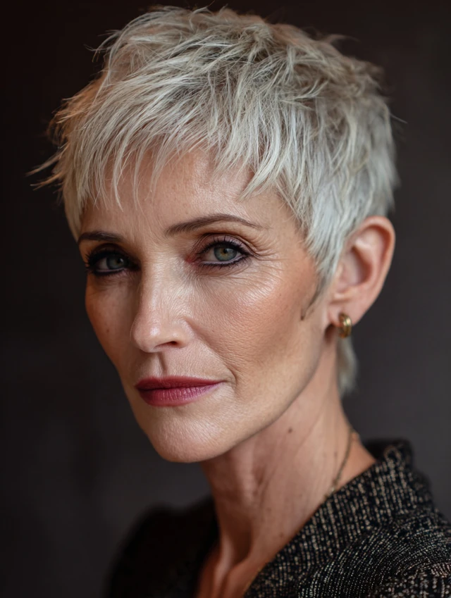 A textured pixie cut adds dimension and highlights facial features without overwhelming the face. The short length keeps the look fresh and modern.