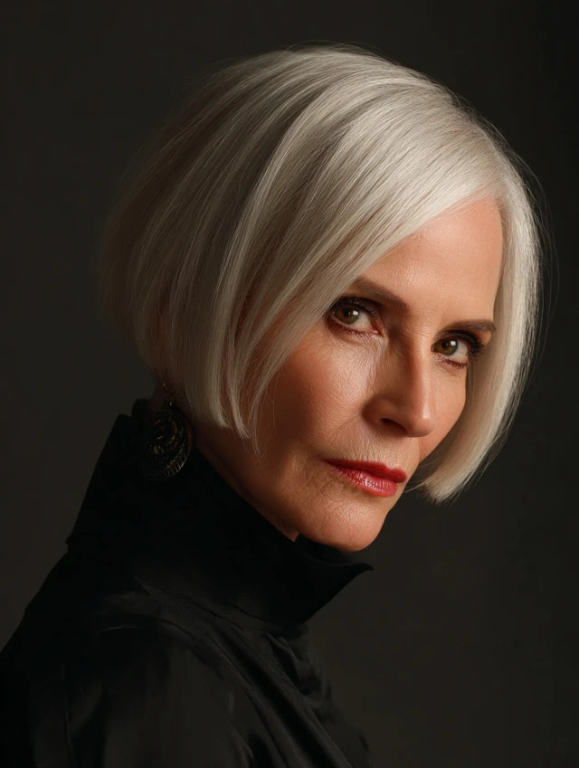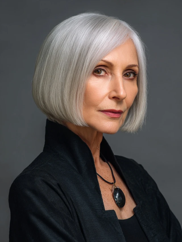 A sleek straight bob emphasizes clean lines and symmetry. The polished finish enhances the natural balance of an oval face.