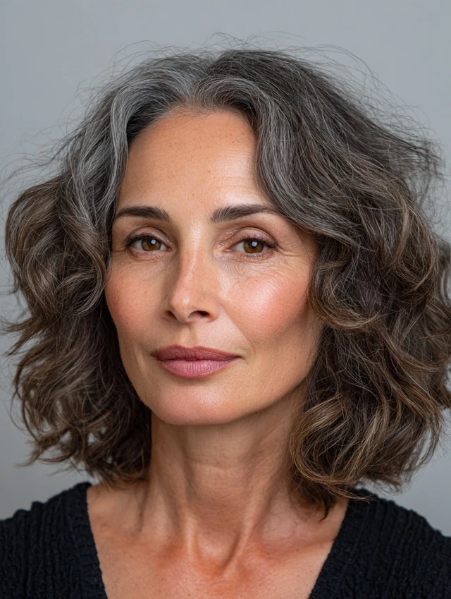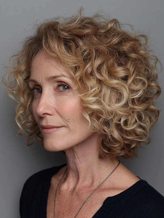 A curly shoulder-length cut adds softness and volume, helping to balance strong angles. The curls create a rounded, flattering shape.