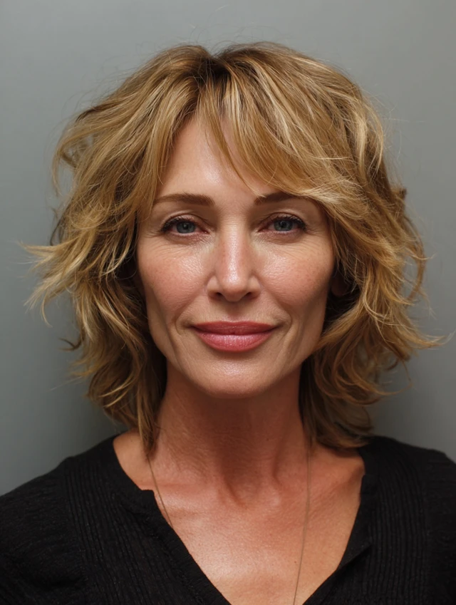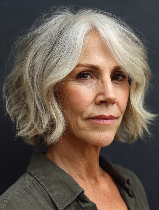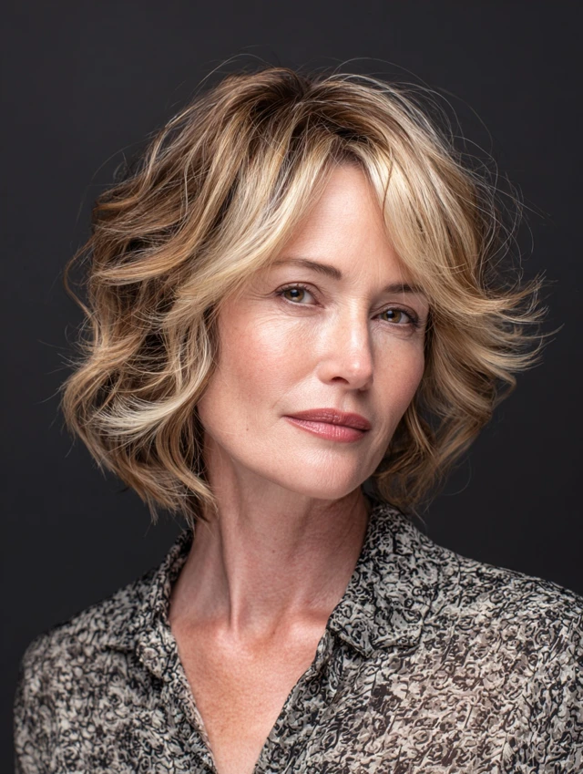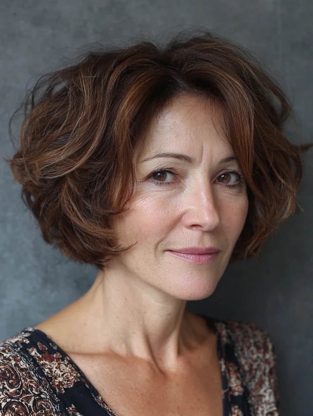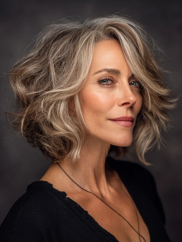 A tousled layered bob adds texture and movement, helping to break up strong lines. The relaxed finish softens the overall appearance.
