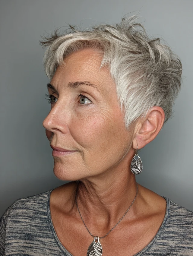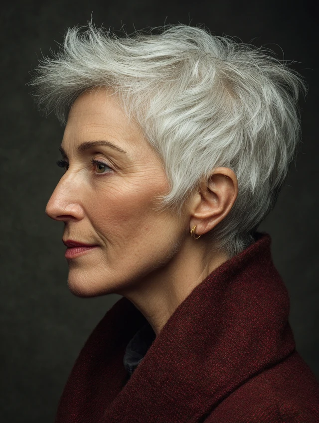 A textured pixie cut softens strong facial features by adding movement and avoiding harsh lines. The layers create dimension without overwhelming the face.