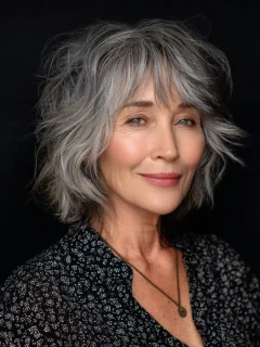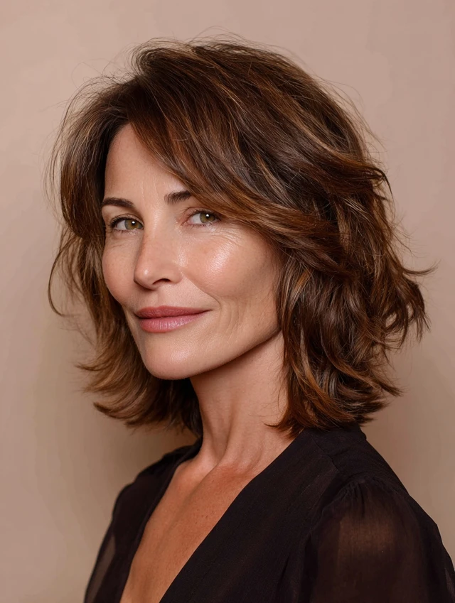 A layered shag cut introduces texture and movement, which helps break up strong lines. The layers create a softer, more relaxed appearance.
