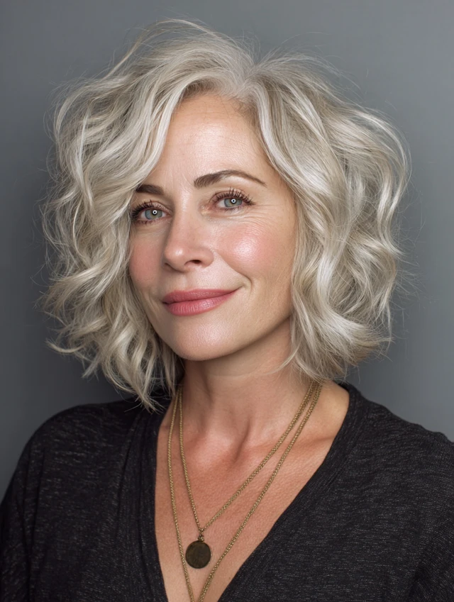 A wavy shoulder-length cut adds softness and movement, helping to reduce the appearance of sharp angles. The waves create a more fluid silhouette.