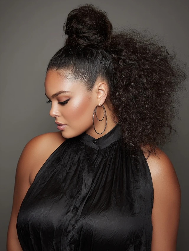 Why It Works: Pulls the face upward and elongates the silhouette.