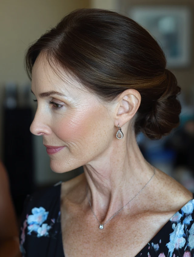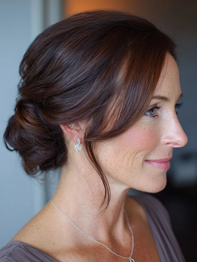 Smoothing the hair before styling ensures a sleek and refined finish. This style holds well and pairs perfectly with formal attire. It’s ideal for mothers who prefer a traditional, polished look that photographs elegantly from every angle.