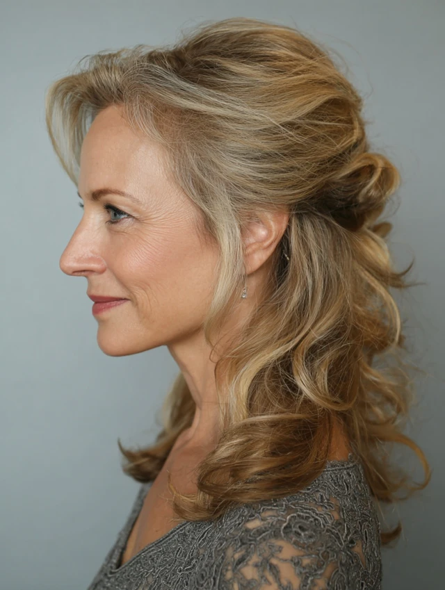 A layered half-up style uses natural layers to create movement while lifting the top section for added structure. The combination keeps the look balanced and light.
