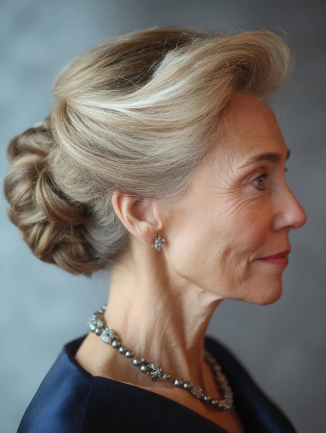 A classic French twist delivers a structured, elongated silhouette that feels timeless and sophisticated. The vertical shape enhances posture and highlights the neckline beautifully.
