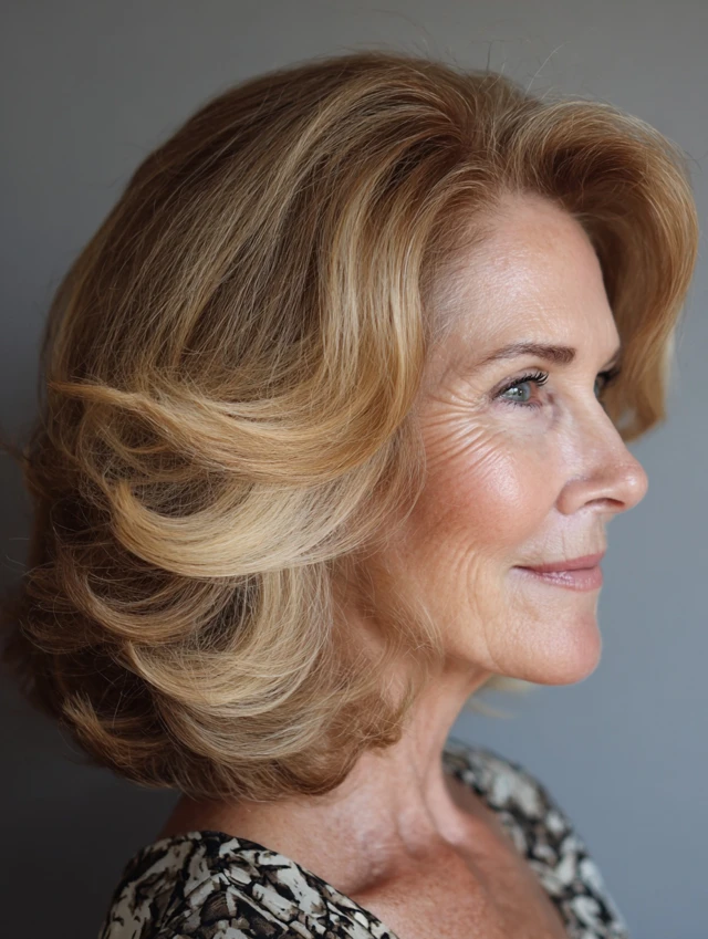 A side-parted blowout adds natural volume and asymmetry, helping frame the face in a flattering way. The side part creates lift and dimension.