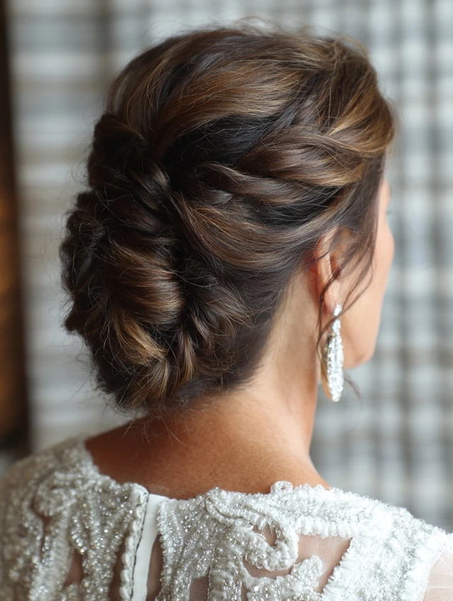 A twisted low updo gathers sections of hair into soft twists at the back, adding detail without complexity. The twists create texture and visual interest.