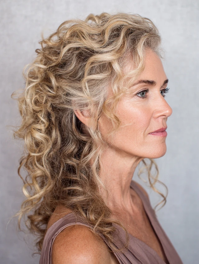 A curly half-up style lifts the top section while allowing curls to fall naturally. This creates volume and a lively texture.