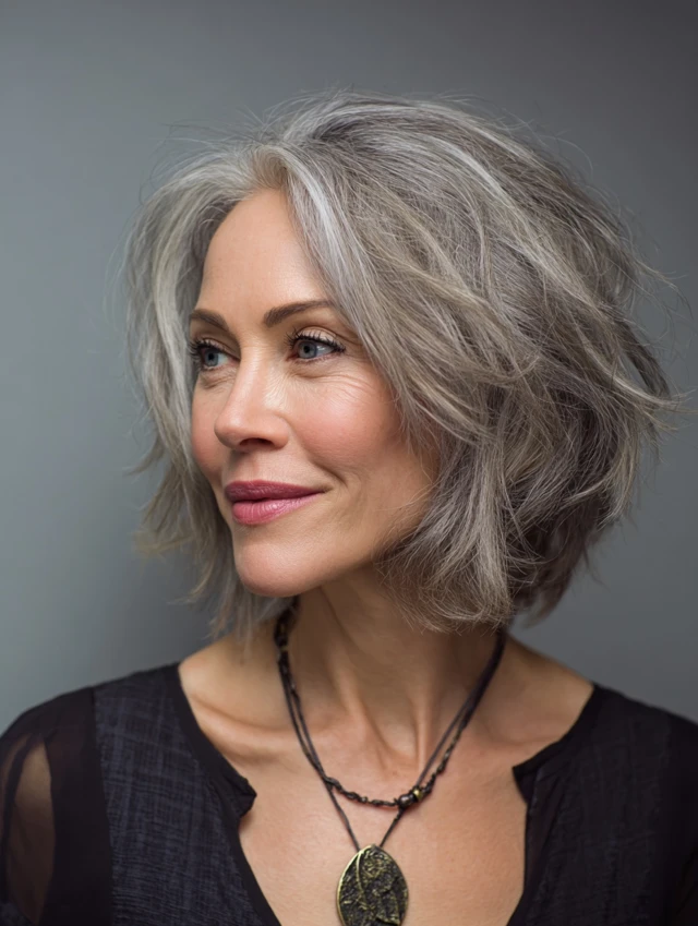 A tousled shoulder-length cut embraces natural texture, creating a relaxed and modern appearance. The slight messiness adds personality without losing structure.