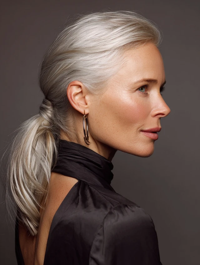 A sleek low ponytail offers a clean, modern look that feels understated yet refined. The smooth finish highlights structure and shine.