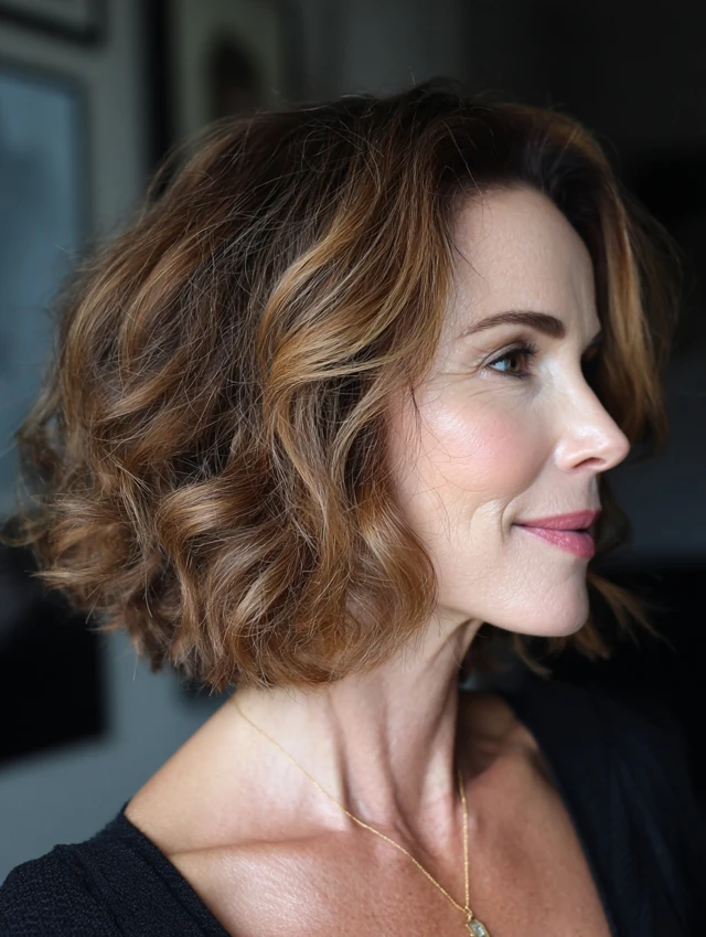 A wavy medium-length cut creates movement and softness, preventing the hair from looking too flat. The waves add natural volume.