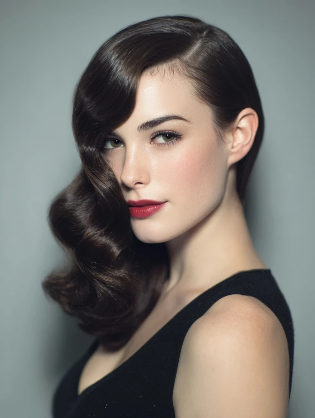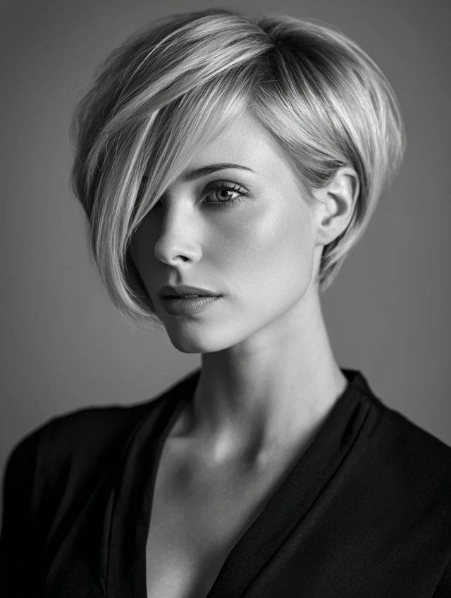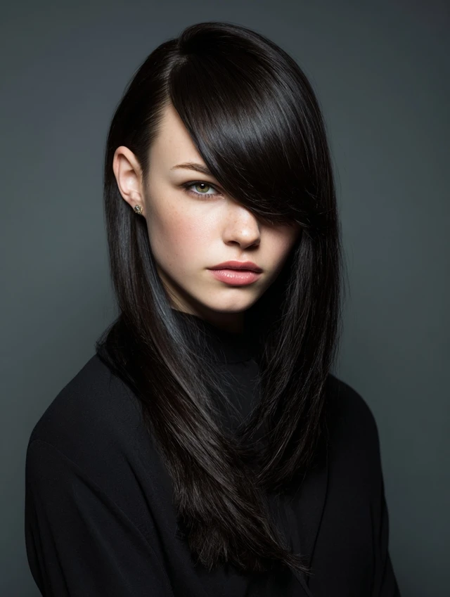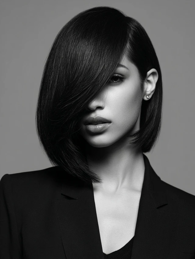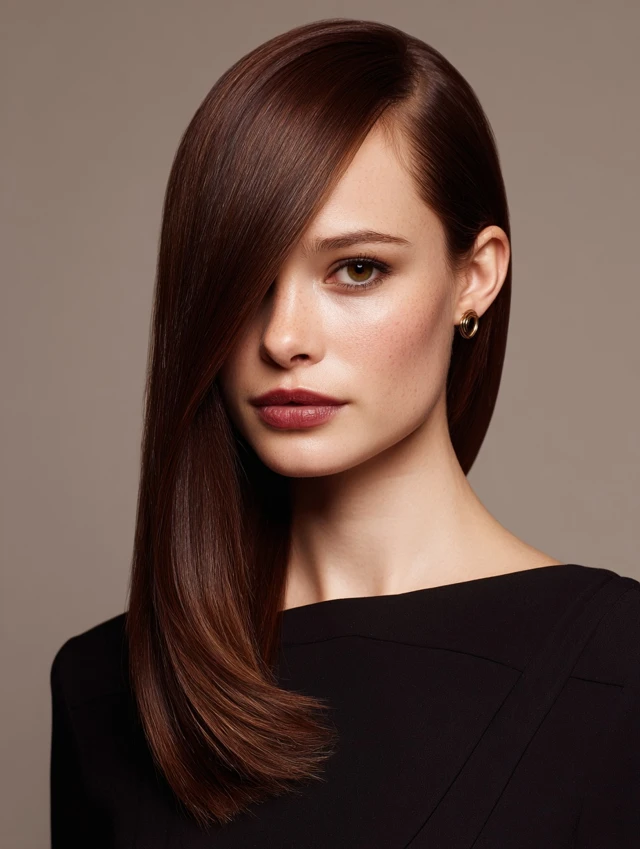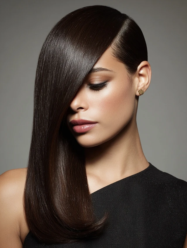Straight, smooth hair with a deep side part exudes sophistication.