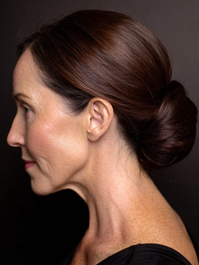 Using a smoothing product enhances shine and control. This style is ideal for formal events and timeless elegance.