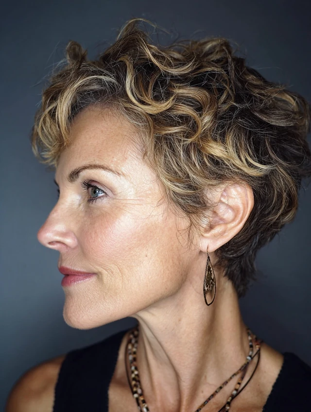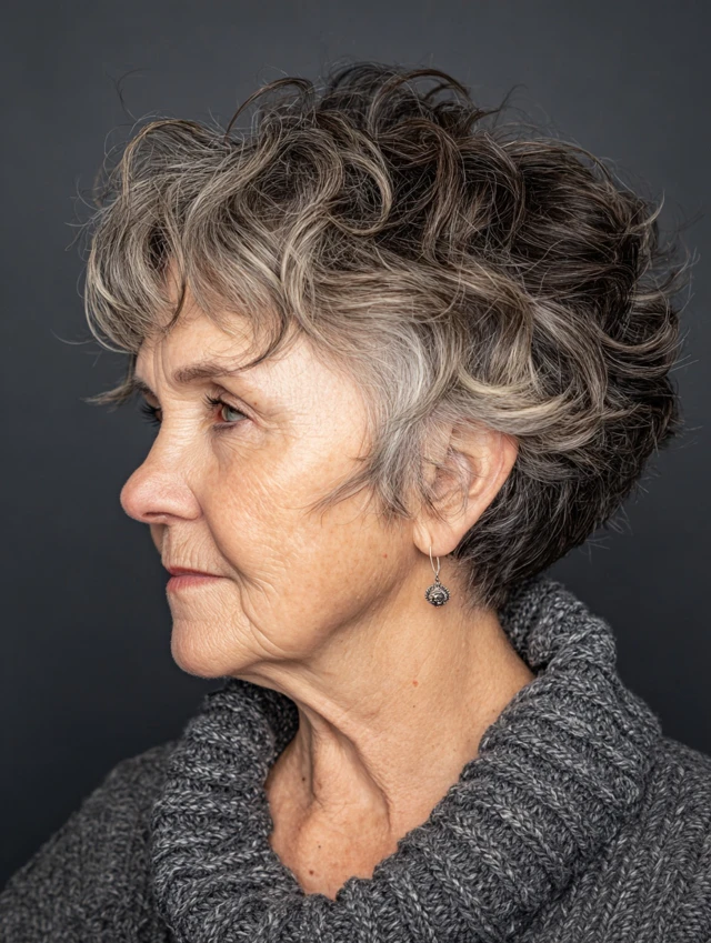 A wavy layered pixie adds texture and movement through short layers. The style feels light while maintaining volume at the crown.