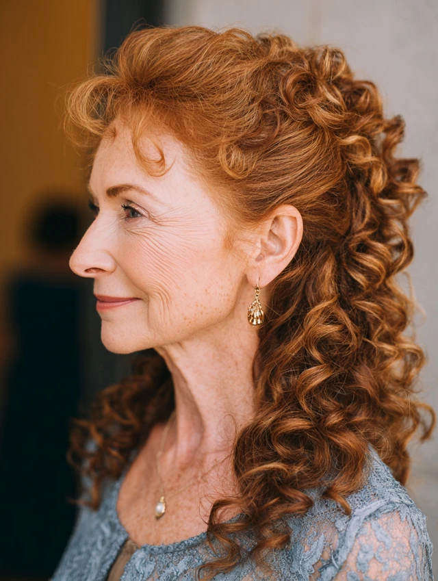 A curly half-up style lifts the top section while allowing curls to fall naturally. This creates a lively and balanced look.