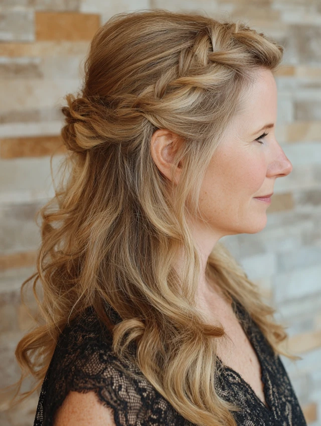 A braided half-up style incorporates a simple braid for added detail while keeping the overall look soft. The braid blends into the rest of the hair.