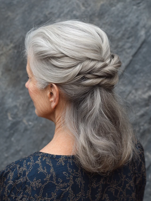 A half-up twisted style lifts the top section while leaving the rest of the hair down. The twists add subtle detail without making the look too elaborate.